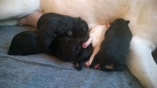 Pyrren pennut syntyivät 15.6. Kolme mustaa poikaa ja kaksi keltaista ja kaksi mustaa tyttöä.